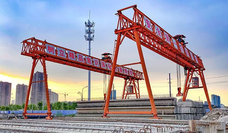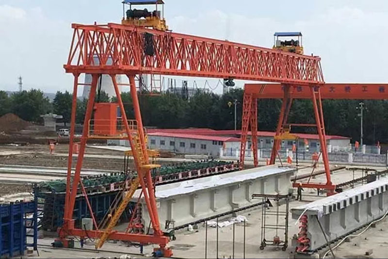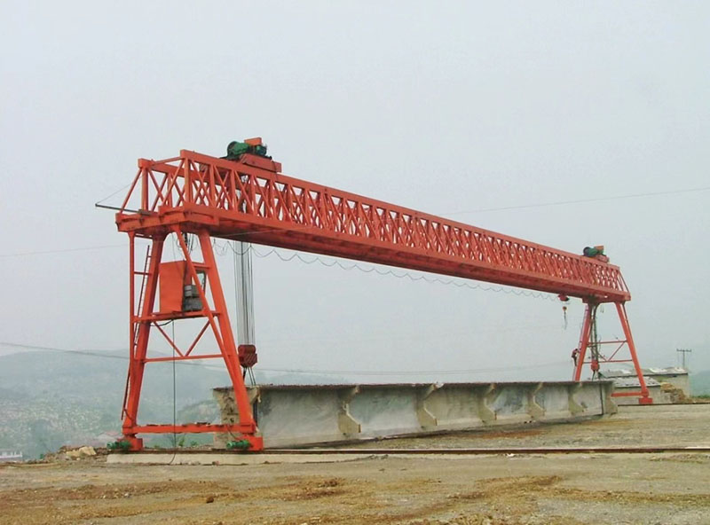 提梁機是一種為橋梁建設而專門設計的一種門式起重機。提梁機既可兩臺配合抬吊預制梁,也可以單臺起重機配雙吊具起吊預制梁,兩臺同時起重的提梁機各自的起重量一般為450噸,單臺起重的提梁機起重量通常可達900噸。它配置支腿行走、天車行走及天車起吊設備,可以實現全方位機械化動作。主要用于將預制梁從制梁臺提吊至存梁臺位,預制梁養護完成后將其從存梁臺位吊運到運梁車上。作為起重設備完成架橋機的組裝和拆卸。還用于架設墩身不高的旱橋。